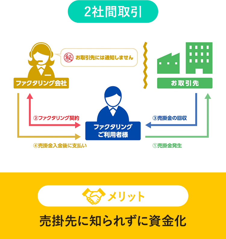 2者間ファクタリングの場合、売掛先への通知は必要ありません。お客様の状況に応じて対応させて頂きます。ご相談ください。