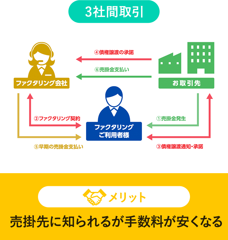 ファクタリングの契約には、2社間取引(お客様と当社のみで契約)と3社間取引(お客様、売掛先、当社の3社で契約)があります。現在は2社間取引を選ばれるお客様が多くなっていますが、双方に違ったメリットがありますので、取引の流れを分かりやすく図式化しました。