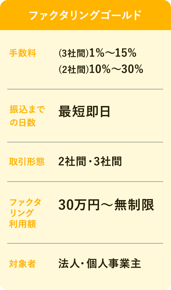 ファクタリング利用額 30万円〜無制限ファクタリング利用額 100万円〜ファクタリング利用額 30万円〜5,000万円